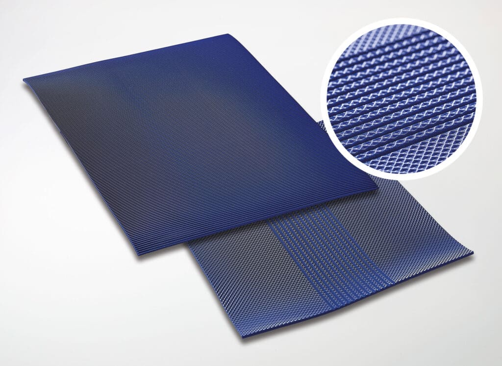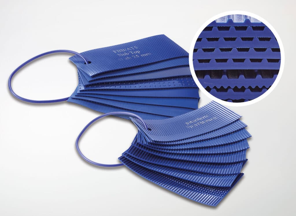 Das Herzstück unserer Transport- und Förderbänder ist eine patentierte Spurführung auf der Unterseite. Diese spezielle Struktur, die mit eigens dafür gefertigten Maschinen geschaffen wird, stellt sicher, dass unsere Bänder im Betrieb besonders hervorragende Eigenschaften bieten können, die weit über den Standard hinausgehen.